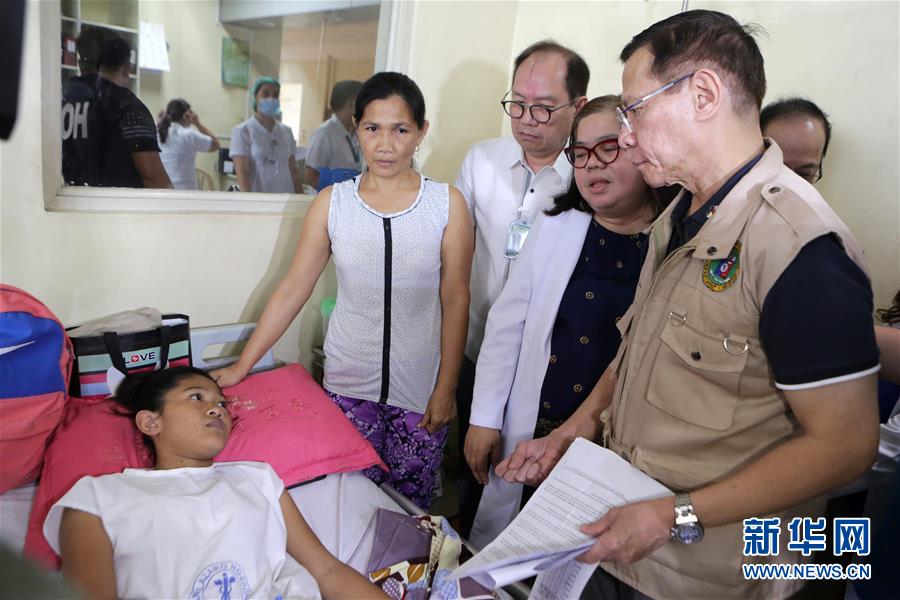 7月16日,在菲律宾首都马尼拉的一家医院,菲律宾卫生部部长弗朗西斯科·杜凯(右一)在登革热病房看望病人。 菲律宾卫生部15日公布的数据显示,今年以来菲律宾登革热病例激增。据当地媒体报道,今年该国至少有450人因感染登革热死亡。 新华社发(鲁埃勒·乌马利摄)