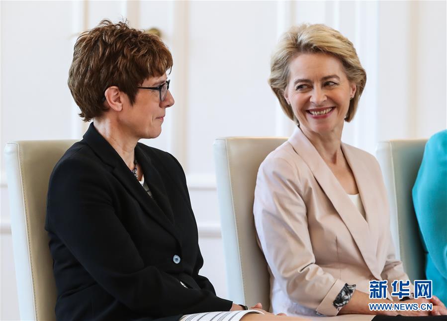 7月17日,在德国首都柏林的总统府,冯德莱恩(右)与克兰普-卡伦鲍尔出席仪式。 德国执政党基督教民主联盟(基民盟)主席安妮格雷特·克兰普-卡伦鲍尔17日出任德国国防部长,接替当选下届欧盟委员会主席的乌尔苏拉·冯德莱恩。 新华社记者单宇琦摄