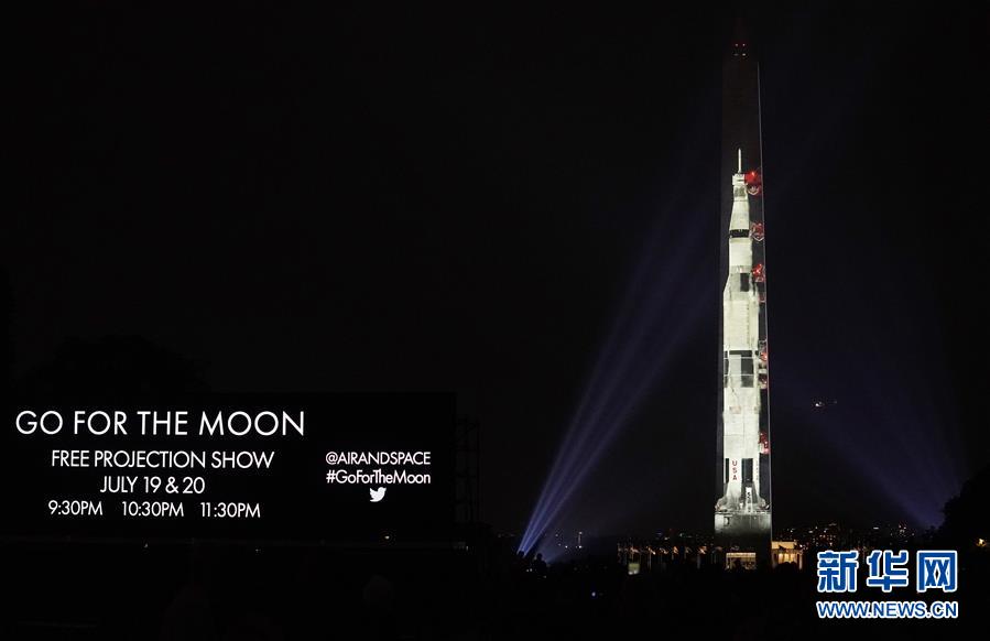 7月16日晚,在美国华盛顿,“土星5号”火箭的影像被投射到华盛顿纪念碑上。新华社记者 刘杰 摄