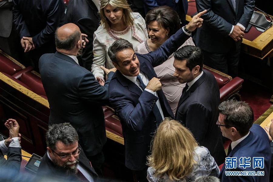 7月17日,在希腊雅典,总理米佐塔基斯(中)在议会议员宣誓就职仪式上与议员交谈。新华社发(帕纳约蒂斯摄)
