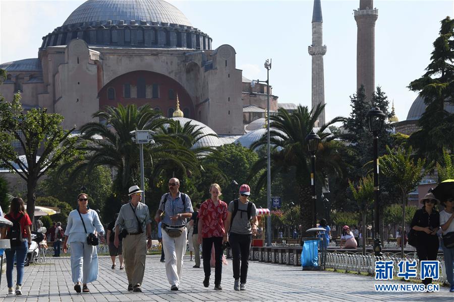 这是7月6日,在土耳其伊斯坦布尔,游客在阿亚索菲亚博物馆附近游览。新华社记者 徐速绘 摄