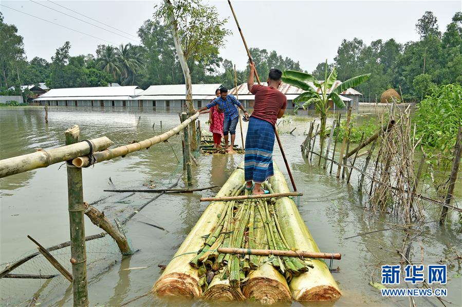 7月18日,在孟加拉国坦盖尔,人们乘筏从水中驶过。 近日的强降雨导致孟加拉国部分地区遭洪水侵袭。 新华社发