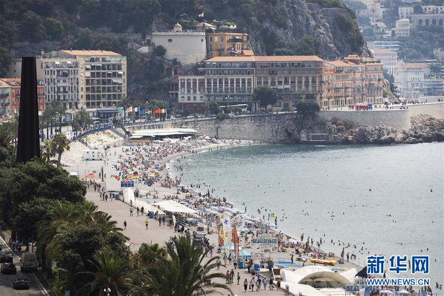 7月22日,在法国南部城市尼斯,人们在海滩上避暑。 据法国气象部门预报,法国大部分地区自上周日晚间起迎来新一轮高温天气,预计将持续一周。 新华社发(法布里斯·桑佩尔摄)