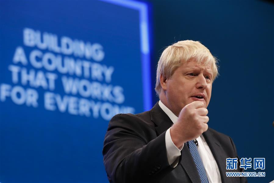 英国前外交大臣、伦敦前市长鲍里斯·约翰逊7月23日当选执政党保守党领袖,将接任英国首相。 这是2017年10月3日,在英国曼彻斯特,时任英国外交大臣鲍里斯·约翰逊在2017年英国保守党年度大会发表主旨演讲。 新华社记者韩岩摄