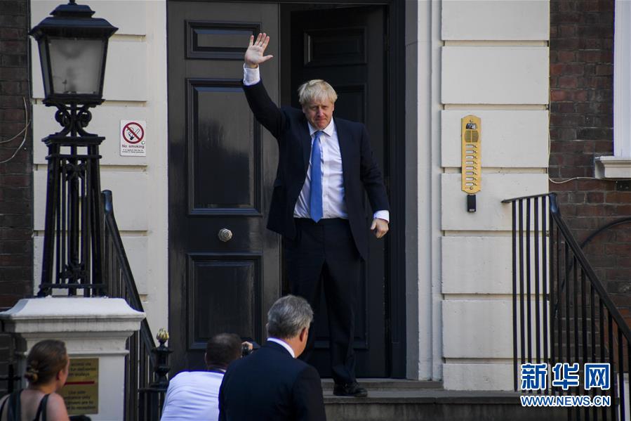 7月23日,在英国伦敦,当选英国保守党领袖的鲍里斯·约翰逊抵达保守党总部后挥手。 英国前外交大臣、伦敦前市长鲍里斯·约翰逊7月23日当选执政党保守党领袖,将接任英国首相。 新华社发(阿尔贝托·佩扎利 摄)