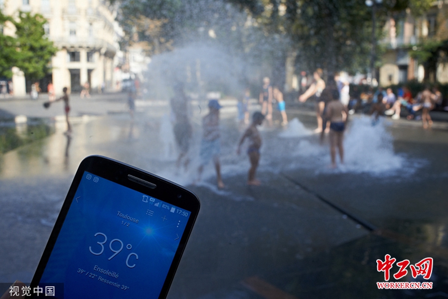 高温“热潮”席卷法国 喷泉池成“避暑圣地”