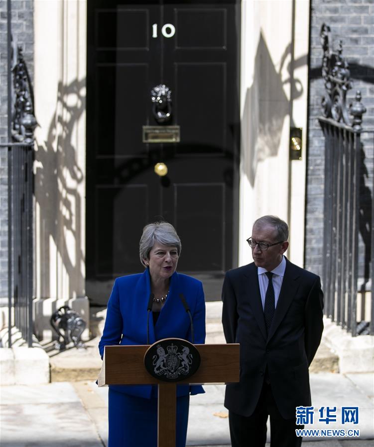 7月24日,在英国伦敦,特雷莎·梅(左)发表告别演说。她随后与丈夫离开唐宁街10号首相府,去向英国女王请辞。新华社记者 韩岩 摄