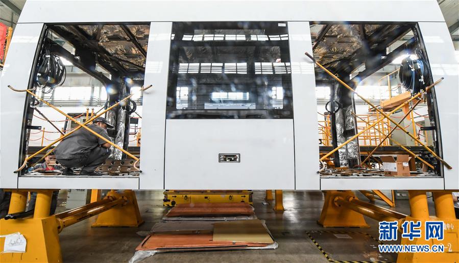 7月25日,中车长春轨道客车股份有限公司工人在车间内为以色列特拉维夫红线轻轨项目车辆接线。 新华社记者 王昊飞 摄