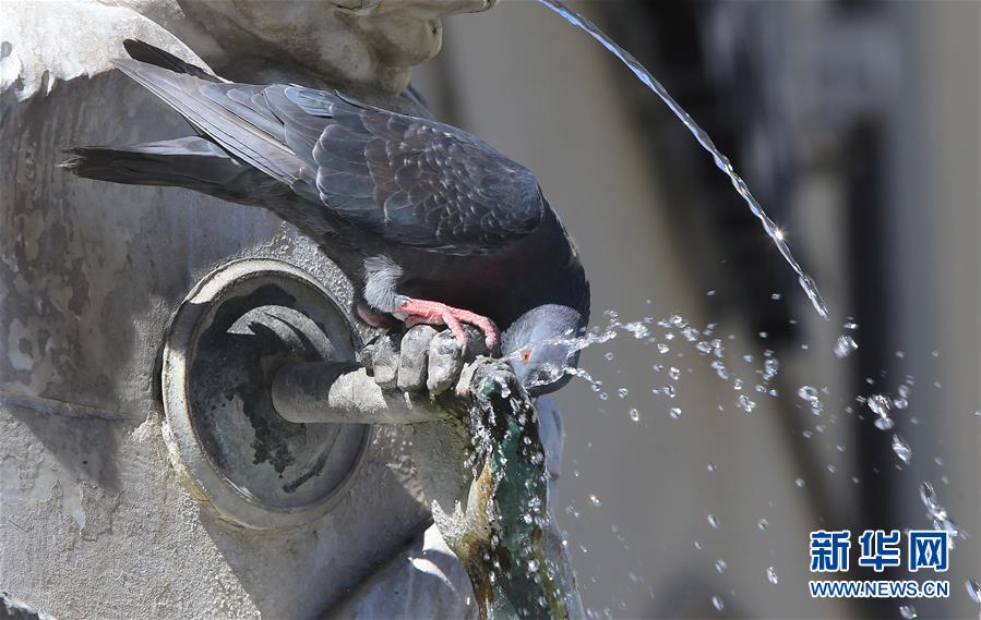 7月25日,在德国慕尼黑,一只鸽子在喷泉出水口饮水。 德国近日遭遇高温侵袭,部分地区25日的气温超过40摄氏度。 新华社发(菲利普·鲁伊兹摄)