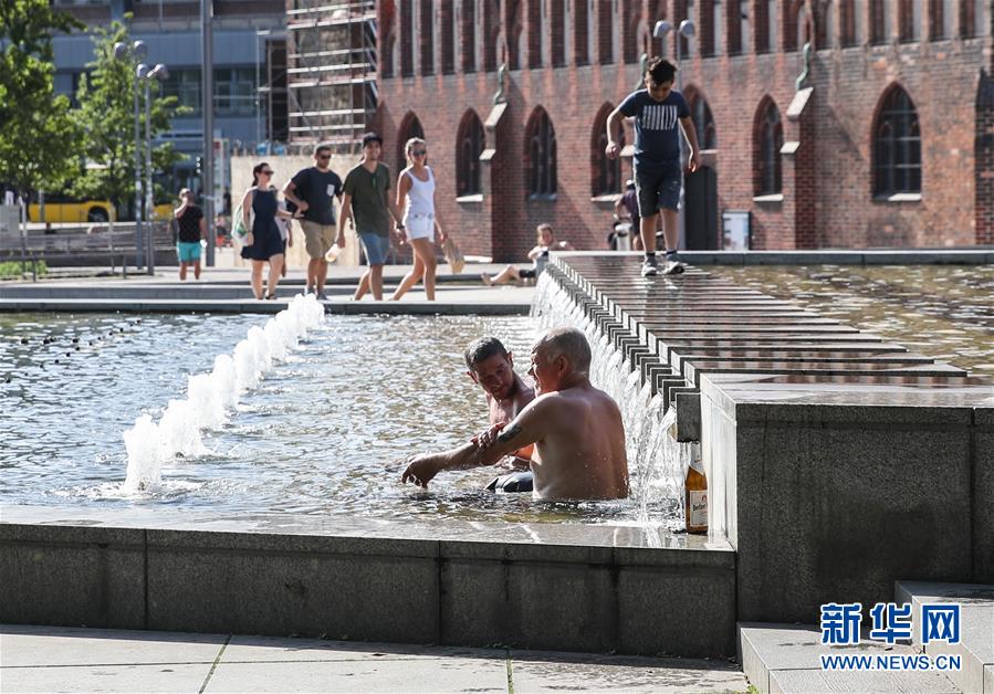 7月25日,在德国首都柏林,人们在一处喷泉戏水纳凉。 德国近日遭遇高温侵袭,部分地区25日的气温超过40摄氏度。 新华社记者 单宇琦 摄