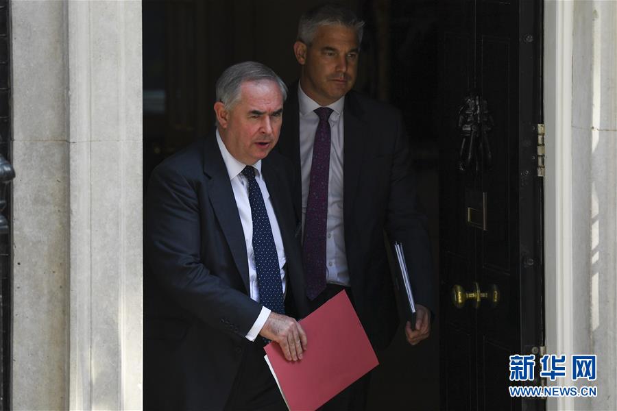 7月25日,在英国伦敦,英国检察总长杰弗里·考克斯(左)与“脱欧”事务大臣斯蒂芬·巴克利参加完内阁会议后离开首相府。 当日,英国首相鲍里斯·约翰逊召开首次内阁会议。 新华社发(阿尔贝托·佩扎利摄)