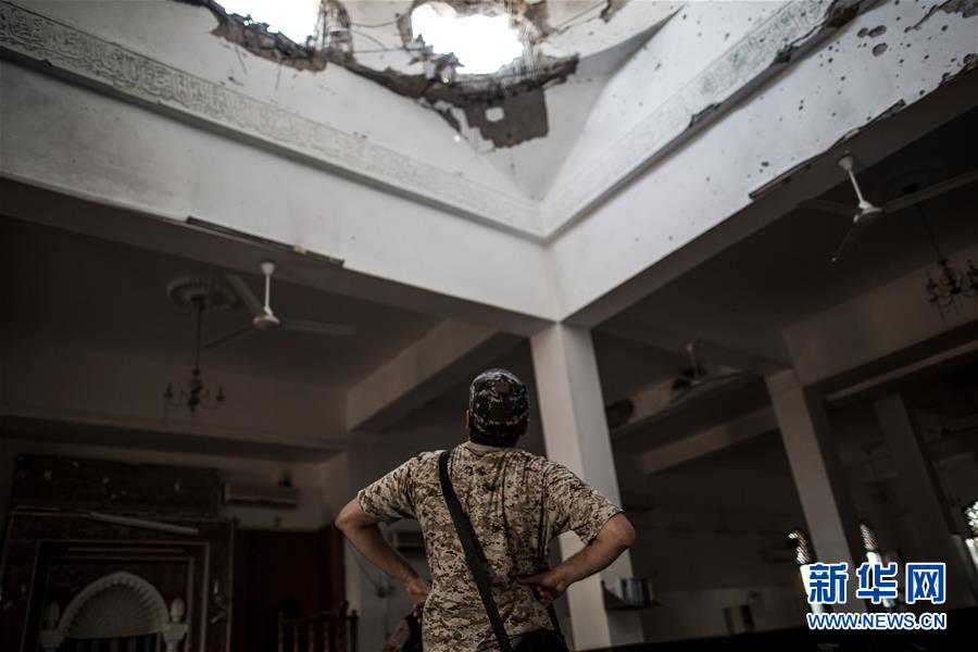 7月25日,在利比亚的黎波里国际机场附近,一名支持利比亚民族团结政府的武装人员查看一座损坏的清真寺。 利比亚民族团结政府20日说,东部军事领导人哈利法·哈夫塔尔麾下“国民军”可能加强对首都的黎波里的攻势。利比亚“国民军”4月4日起对的黎波里发起军事行动,与控制该市的利比亚民族团结政府军队交战。 新华社发(阿姆鲁摄)
