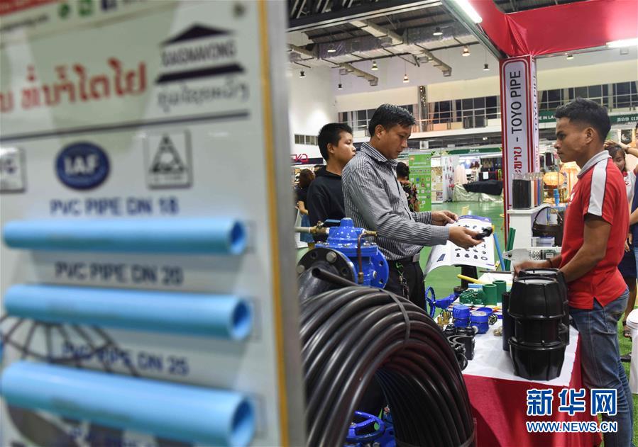 7月26日,在老挝首都万象,顾客在展览会上选购商品。 “2019老挝制造”展览会于7月20日至28日在万象会展中心举办。 新华社发(刘艾伦 摄)