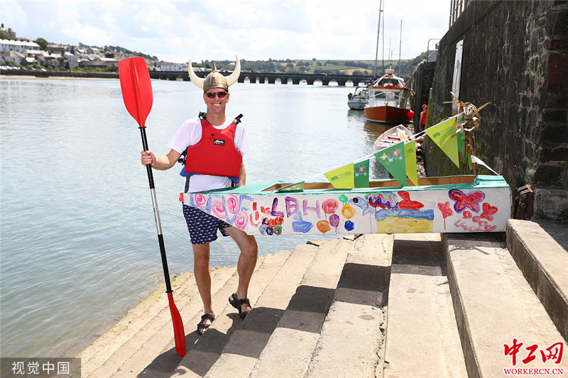 当地时间2018年7月28日,英国拜德福德镇,当地举行了一场别开生面的纸板船比赛,参赛选手们携自制各式纸船亮相,比赛趣味十足。图片作者:Michael Steele/视觉中国