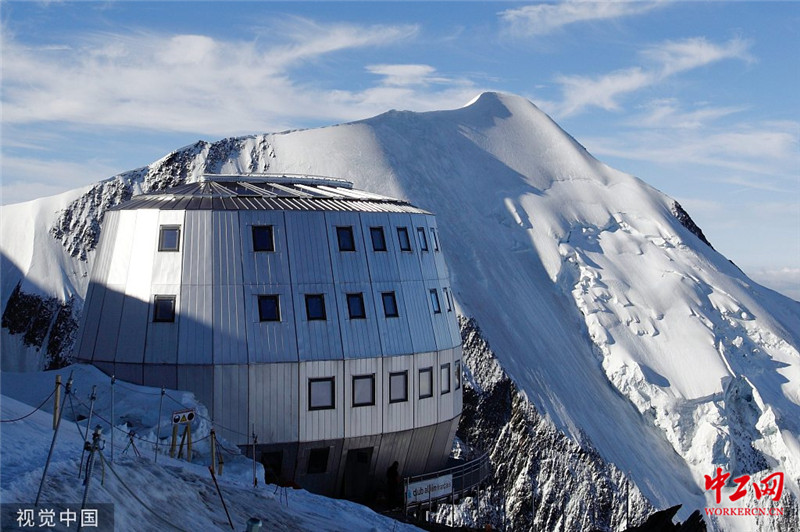 2012年8月6日消息(具体拍摄时间不详),法国圣热尔维,一座坐落在阿尔卑斯山脉上海拔3835米的旅馆近日落成,旅馆目前处于试运行状态直到8月底向公众开放。这座旅馆共有120个床位,达到了高环境质量标准。