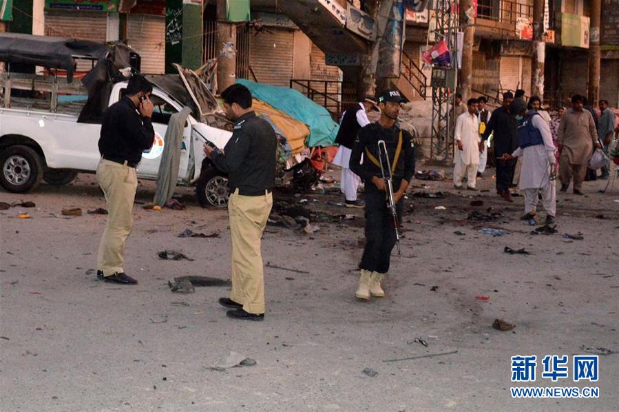 7月30日,在巴基斯坦西南部奎达市,安全人员查看爆炸袭击现场。 巴基斯坦西南部俾路支省首府奎达30日傍晚发生一起爆炸袭击事件。当地医院官员说,袭击已造成4人死亡、34人受伤。 新华社发(伊尔凡摄)