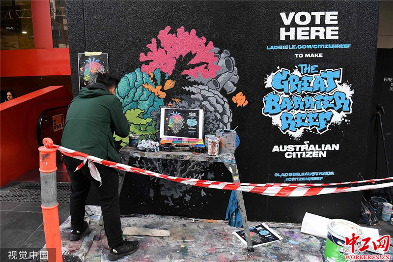 当地时间2019年7月31日,澳大利亚墨尔本,艺术家Ed Wong沿着墨尔本街道创作了一幅一半珊瑚形状、一半的心脏解剖图的壁画。代表由于气候变化,大堡礁一半的珊瑚已经死亡,以呼吁人们保护环境。超过25000名澳大利亚人签署了一份请愿书,要求授予大堡礁澳大利亚公民身份,以获得与所有澳大利亚公民一样的权利和保护。图片作者:WILLIAM WEST /视觉中国