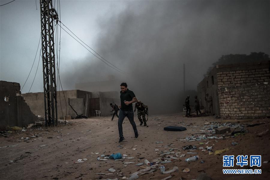 7月30日,在利比亚的黎波里,利比亚民族团结政府武装人员与利比亚“国民军”武装(不在画面中)交战。 新华社发(阿姆鲁摄)