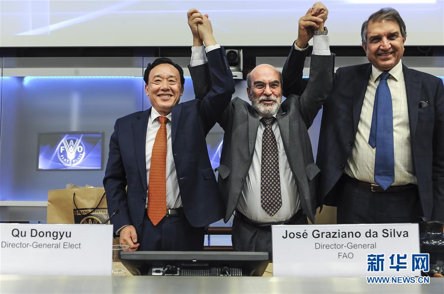 7月31日,在意大利罗马,屈冬玉(左)和若泽·格拉齐亚诺·达席尔瓦(中)出席联合国粮食及农业组织总干事交接仪式。 联合国粮食及农业组织7月31日在意大利首都罗马举行总干事交接仪式。今年6月份当选的粮农组织新任总干事屈冬玉将从8月1日起正式上任,接替若泽·格拉齐亚诺·达席尔瓦。 新华社记者刘咏秋摄