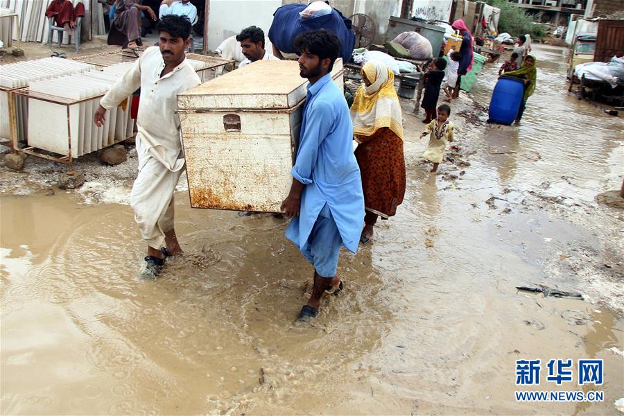 7月31日,在巴基斯坦南部城市卡拉奇,人们把物品搬出被洪水淹没的房屋。 因连日降雨,巴基斯坦多地发生洪水灾情。 新华社发