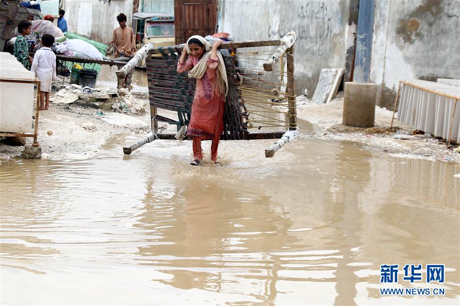 7月31日,在巴基斯坦南部城市卡拉奇,一名女子将家具搬出被洪水淹没的房屋。 因连日降雨,巴基斯坦多地发生洪水灾情。 新华社发