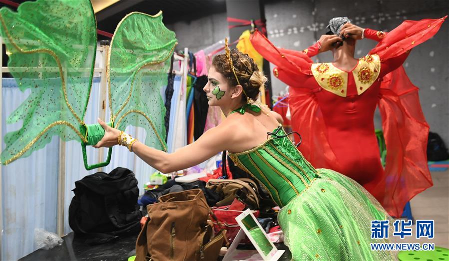 8月1日,拉萨拉在长影世纪城演员休息室穿戴演出服。新华社记者 王昊飞 摄