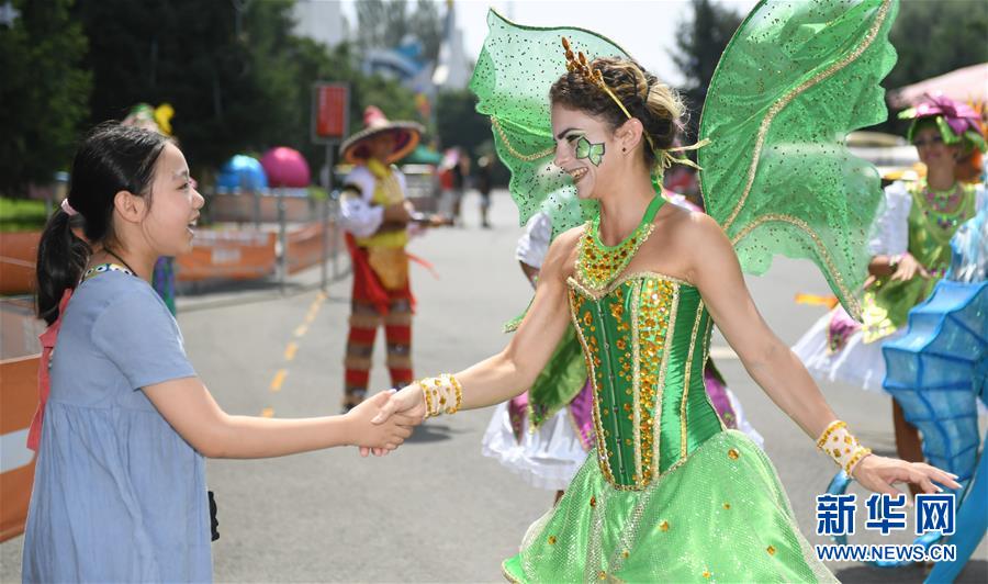 8月1日,拉萨拉(右)在长影世纪城与游客打招呼。新华社记者 王昊飞 摄