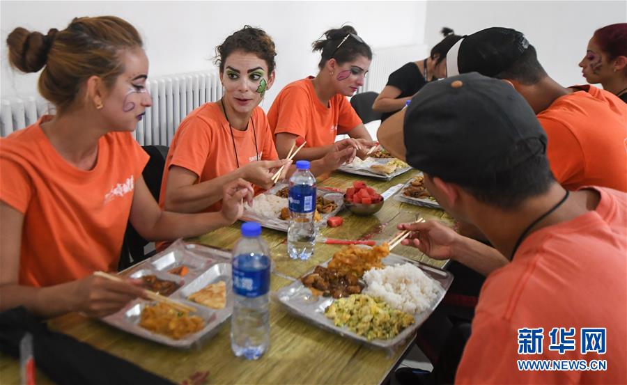 8月1日,拉萨拉(左二)在餐厅内与同事共进午餐。新华社记者 王昊飞 摄
