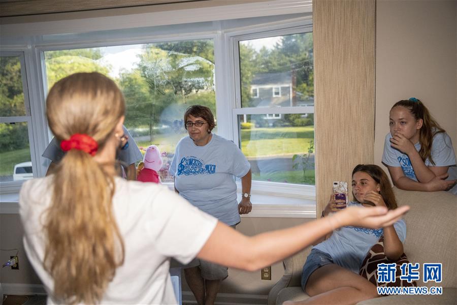 7月27日,在美国新泽西州伯纳德镇的中文指导老师家中,琳恩·贝拉特(右三)、女儿白琳(右二)和女儿白兰在观看女儿白丽表演中文歌曲。 新华社记者 王迎 摄