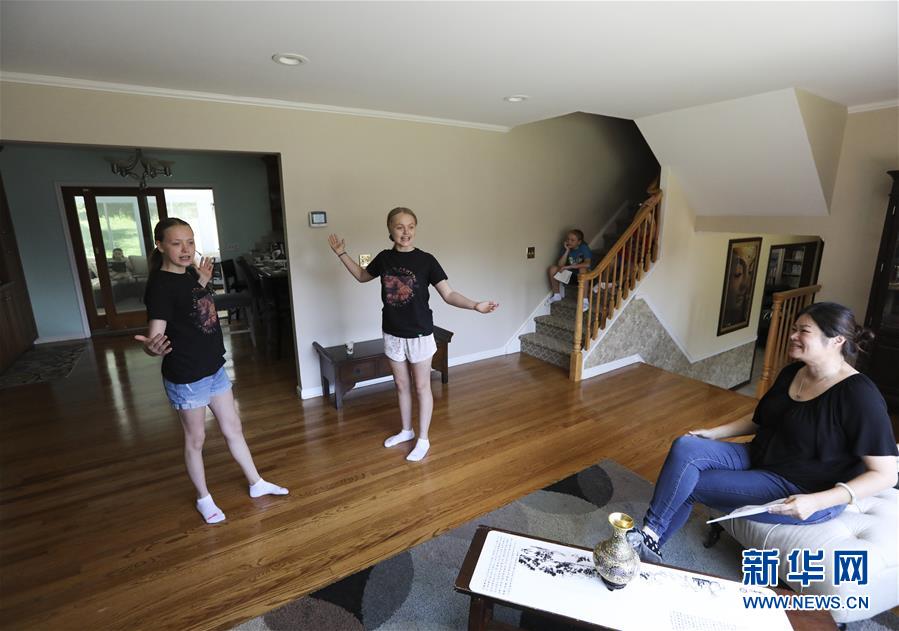 7月13日,在美国新泽西州伯纳德镇的中文指导老师家中,琳恩·贝拉特的女儿白丽(左二)和白蕾(左一)练习中文演讲。 新华社记者 王迎 摄