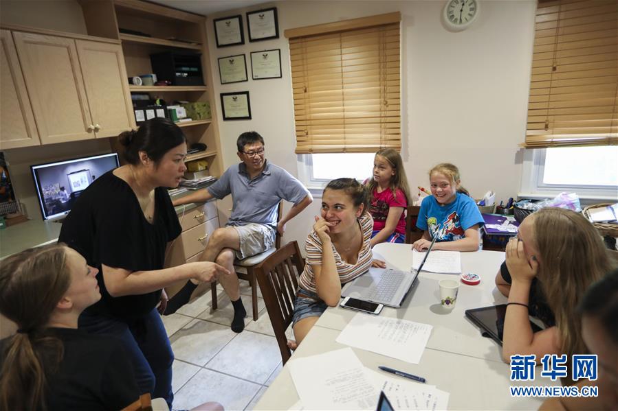 7月13日,在美国新泽西州伯纳德镇的中文指导老师家中,琳恩·贝拉特的女儿们与林老师交流。 新华社记者 王迎 摄