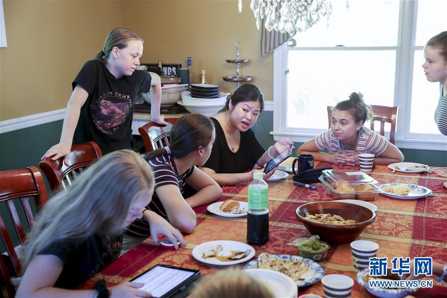 7月13日,在美国新泽西州伯纳德镇的中文指导老师家中,琳恩·贝拉特的女儿们与林老师(中)交流。 新华社记者 王迎 摄