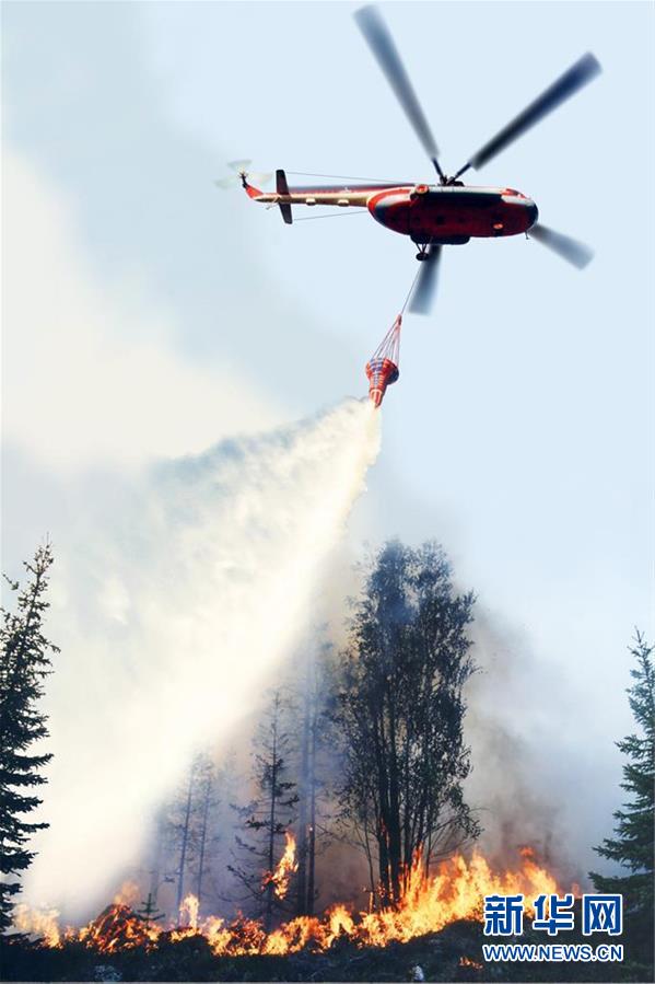 8月1日,在俄罗斯克拉斯诺亚尔斯克,消防直升机在空中灭火。 连日来,俄罗斯西伯利亚及远东地区发生多起森林火灾。 新华社/欧新