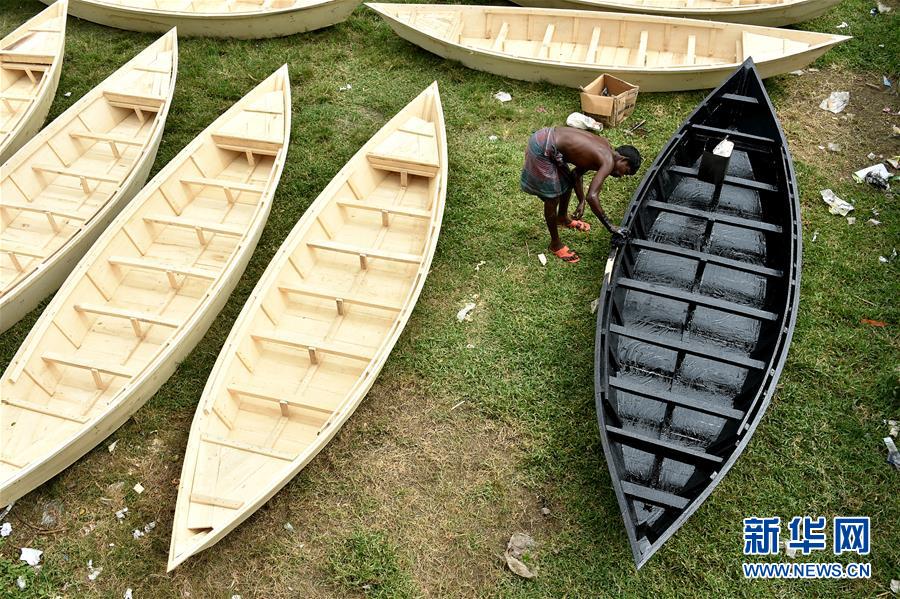 7月31日,在孟加拉国首都达卡西北60多公里的马尼格甘杰,工人在市场上给船只上漆。新华社发