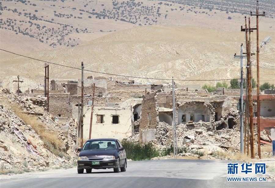 7月31日,在伊拉克北部尼尼微省辛贾尔镇,车辆驶过被极端组织摧毁的房屋建筑。 新华社发