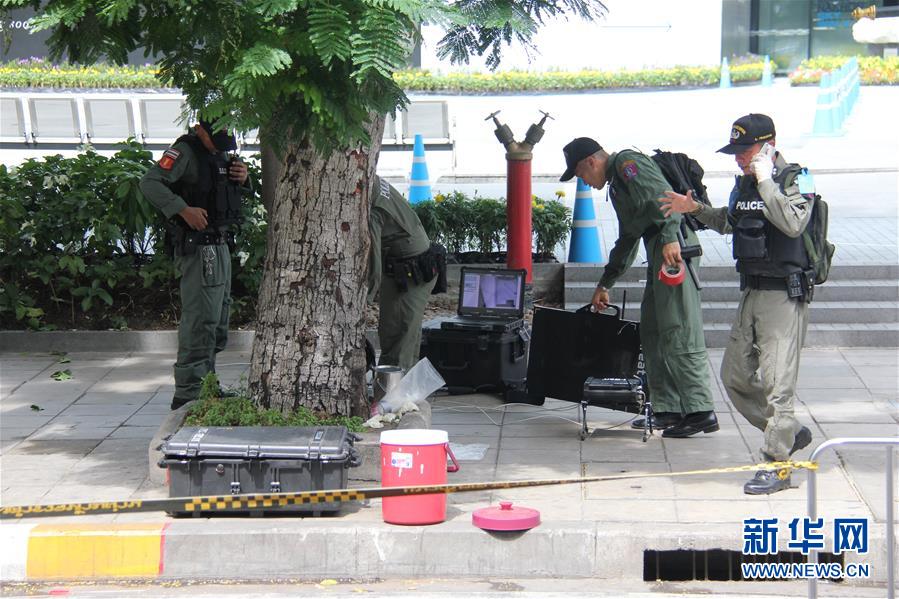 8月2日,在泰国曼谷,警察在发生爆炸的冲暖诗站附近工作。 新华社记者 杨舟 摄