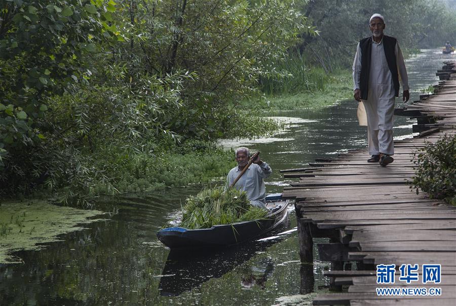 8月2日,在印控克什米尔首府斯利那加达尔湖上,一名男子划着装载草料的船只前行。新华社发(贾维德·达尔摄)