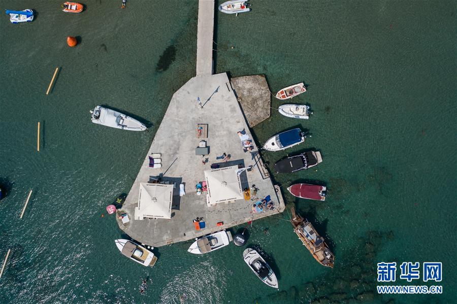 8月2日,人们在希腊雅典附近的海滩消夏。 新华社发(莱夫特里斯·帕察里斯摄)