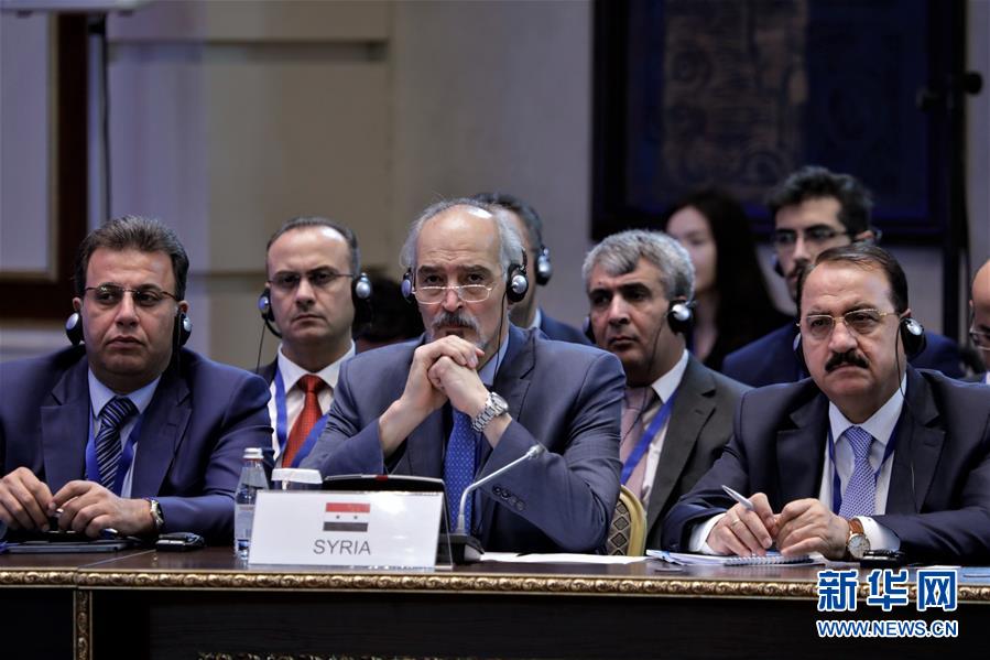 8月2日,在哈萨克斯坦首都努尔苏丹,叙利亚代表团团长、叙常驻联合国代表贾法里(中)参加会谈。新华社发(奥斯潘诺夫摄)