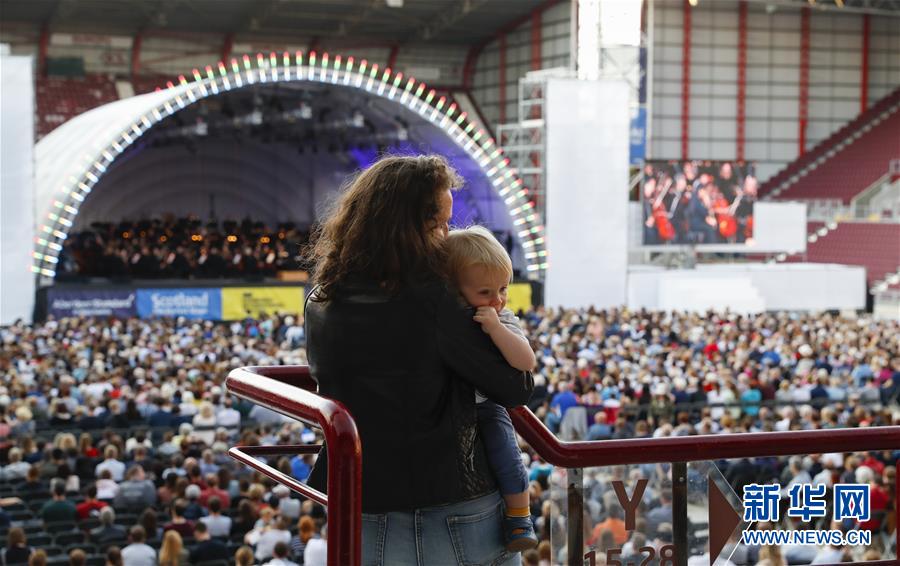 8月2日,在英国苏格兰爱丁堡,一名女士怀抱婴儿欣赏音乐会。新华社记者 韩岩 摄