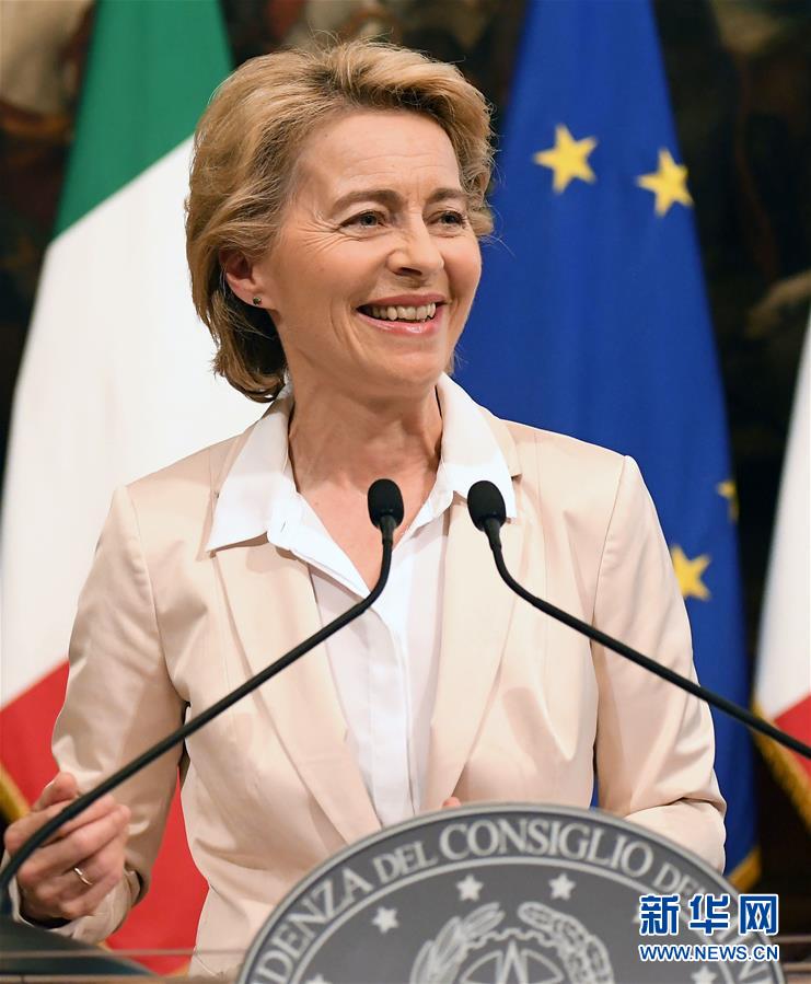 8月2日,在意大利罗马,下届欧盟委员会主席冯德莱恩在与意大利总理孔特(不在画面中)会晤前举行的联合记者会上讲话。新华社发(阿尔贝托·林格里亚摄)