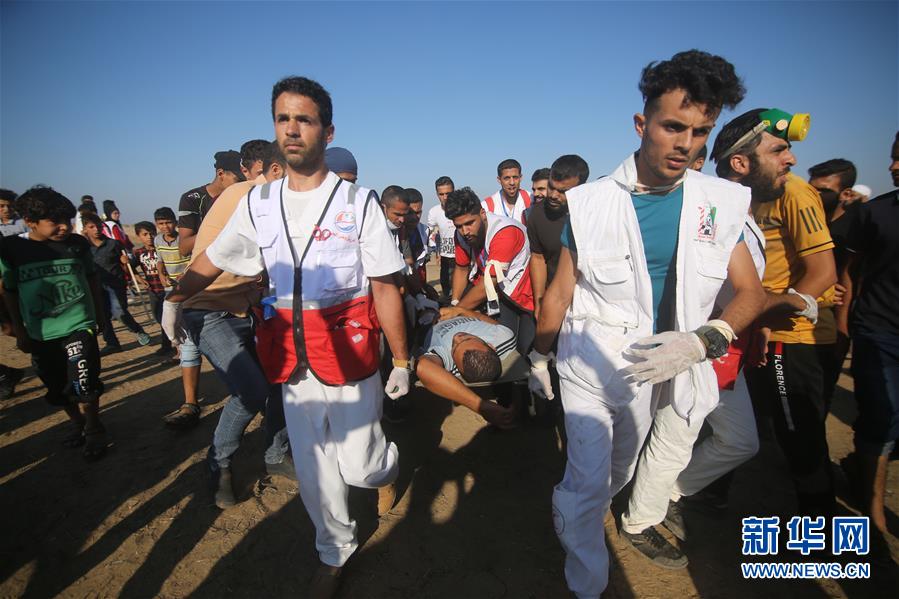 8月2日,在加沙地带与以色列交界地区,巴勒斯坦医务人员转移一名伤者。新华社发(哈立德·奥马尔摄)
