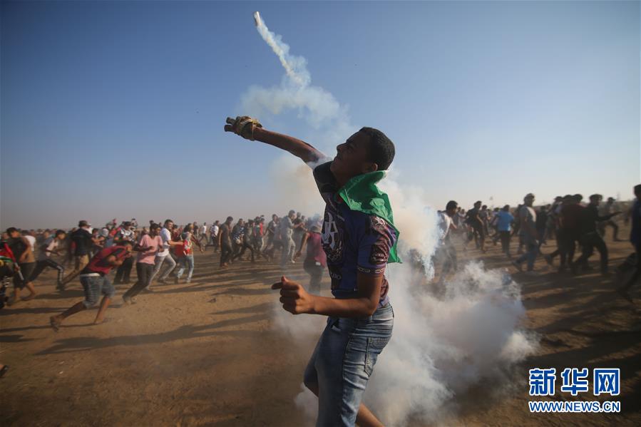 8月2日,在加沙地带与以色列交界地区,一名巴勒斯坦示威者掷回以军发射的催泪弹。新华社发(哈立德·奥马尔摄)