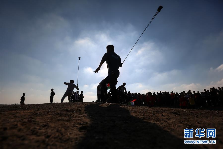 8月2日,在加沙地带与以色列交界地区,巴勒斯坦示威者向以色列士兵投掷石块。新华社发