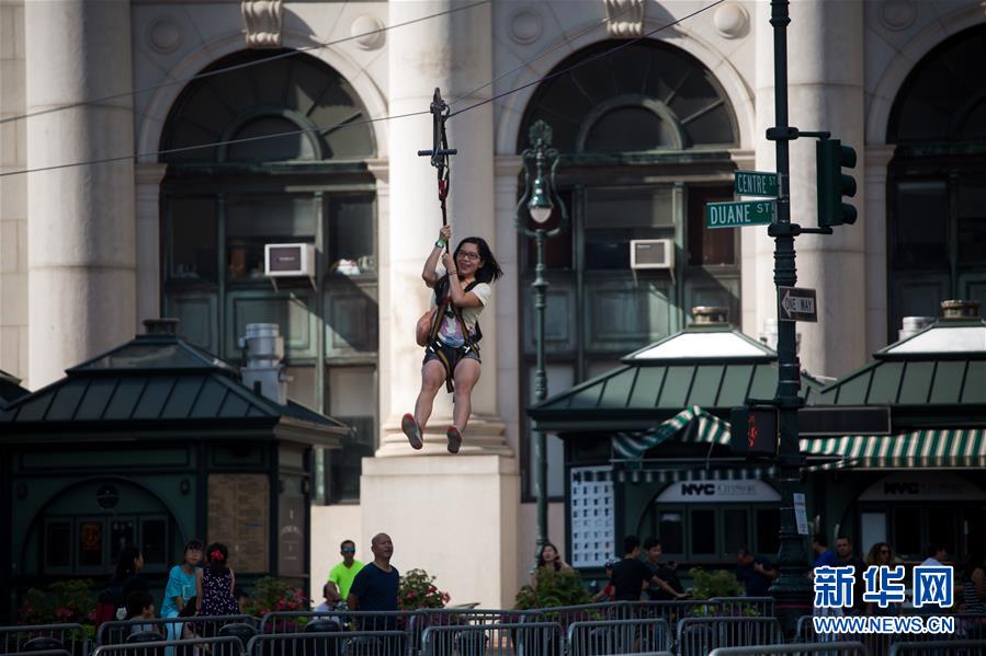8月3日,在美国纽约曼哈顿,一名女子在开放的街道上玩滑索。新华社发(郭克摄)