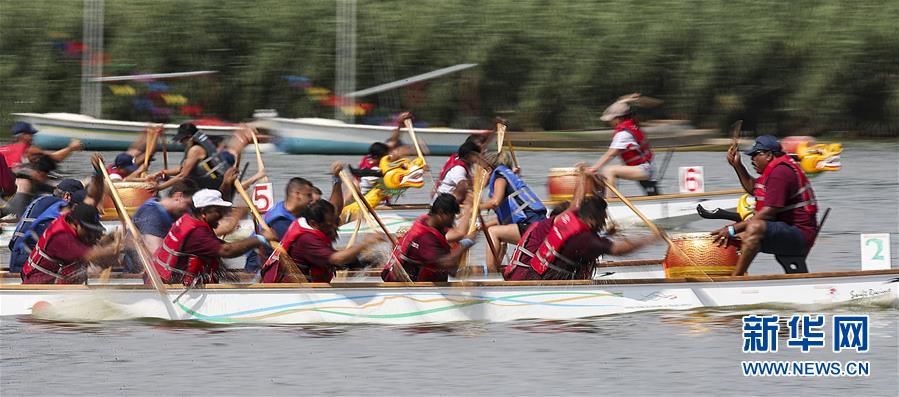 8月3日,在美国纽约科罗娜公园,选手们在龙舟比赛中奋力划桨。