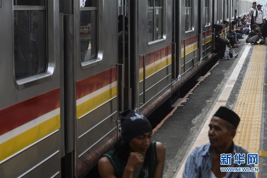 8月4日,在印度尼西亚南唐格朗,乘客在因停电而停驶的列车车厢外等待。新华社发(阿贡摄)