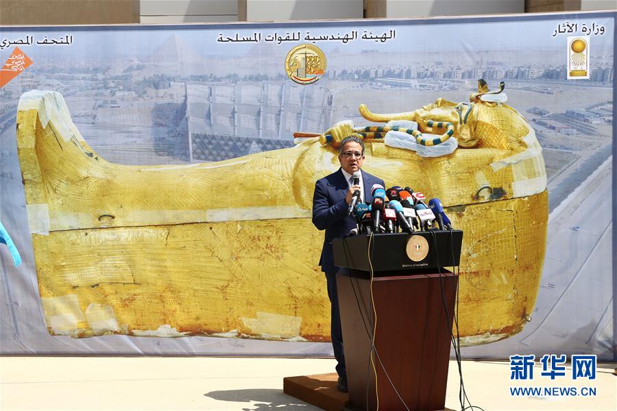 8月4日,在埃及首都开罗的大埃及博物馆,埃及文物部长哈立德·阿纳尼在仪式上讲话。埃及文物部4日在位于开罗郊区的大埃及博物馆文物保护中心举行仪式,宣布古埃及法老图坦卡蒙外层木质镀金棺正在进行消毒工作,即将开始正式修复。新华社发(艾哈迈德·戈马摄)