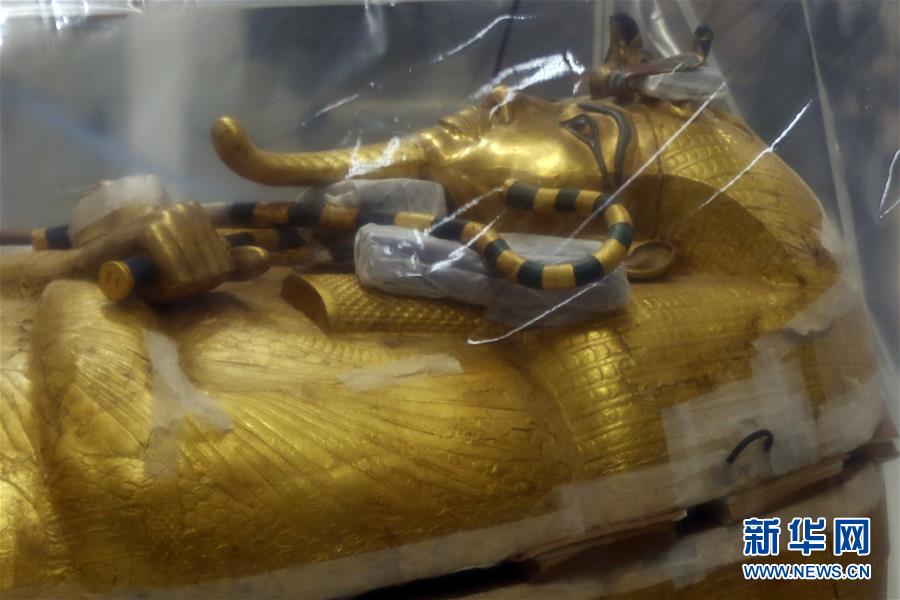 这是8月4日在埃及首都开罗的大埃及博物馆文物保护中心拍摄的古埃及法老图坦卡蒙外层木质镀金棺。埃及文物部4日在位于开罗郊区的大埃及博物馆文物保护中心举行仪式,宣布古埃及法老图坦卡蒙外层木质镀金棺正在进行消毒工作,即将开始正式修复。新华社发(艾哈迈德·戈马摄)