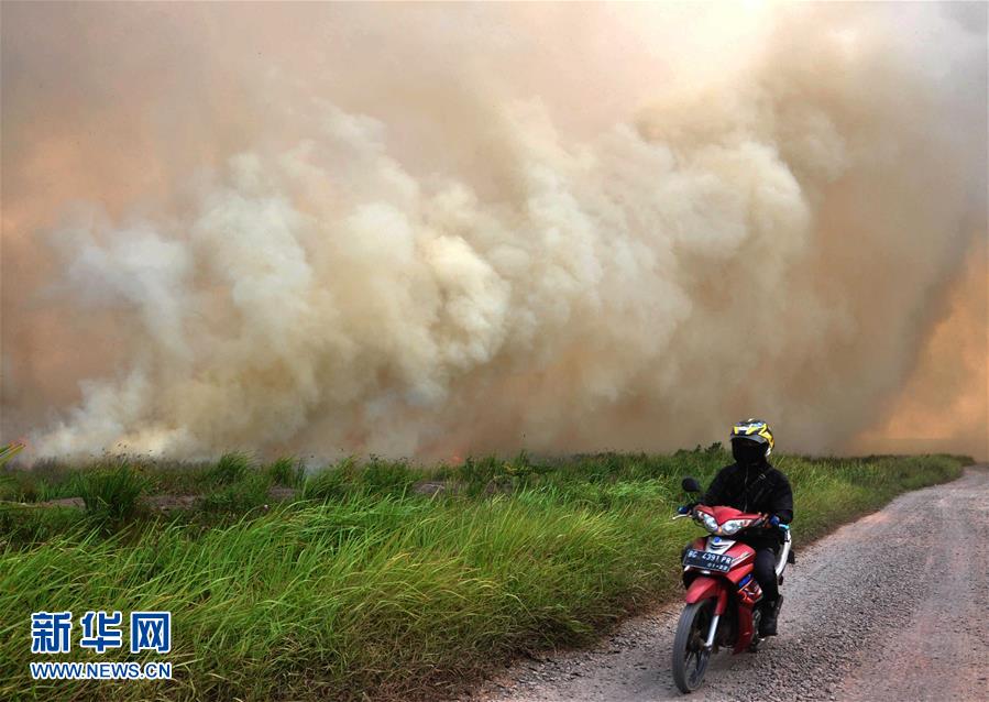 8月5日,在印度尼西亚南苏门答腊省,一名男子骑摩托车经过滚滚浓烟。 近日,印度尼西亚南苏门答腊省一处泥炭地发生火灾,当地政府部署近六千名人员参与灭火。 新华社发(穆罕默德 摄)